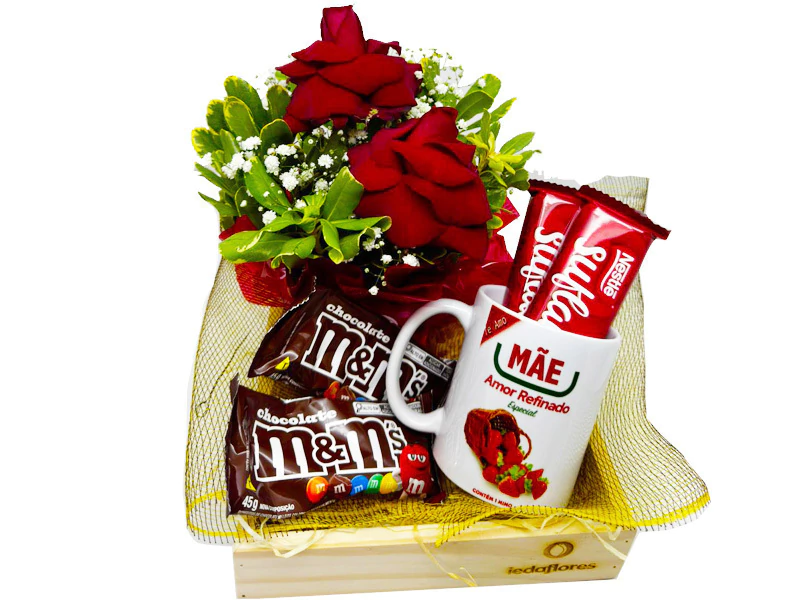 O kit inclui uma bandeja de madeira elegante, uma caneca temática que traz um toque de amor, e um arranjo com 2 rosas colombianas que adiciona um charme inigualável. Para completar, uma deliciosa seleção de chocolates faz deste presente uma experiência única e irresistível.